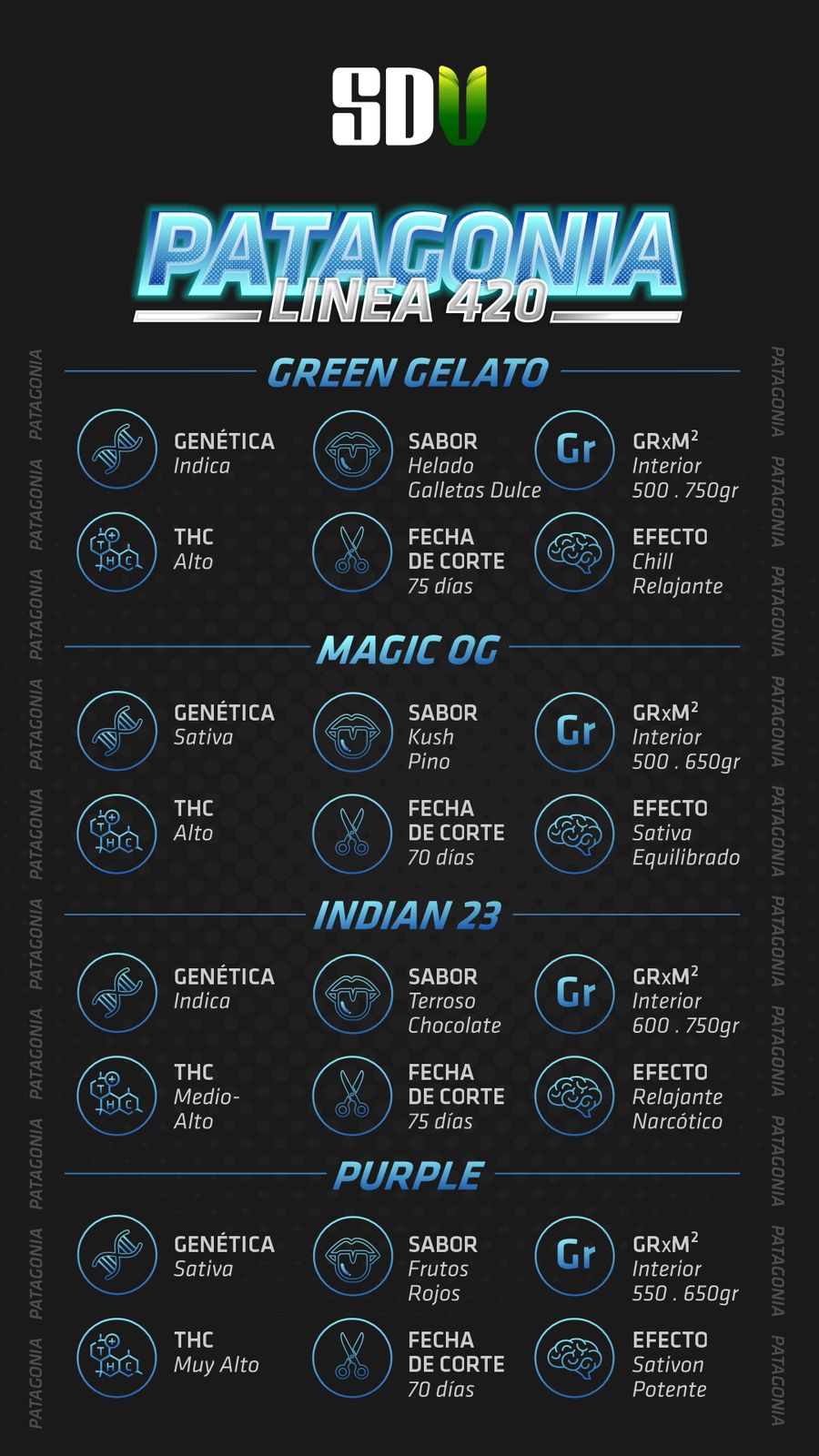 El Mix Patagonia SDV es una combinación excepcional de genéticas autoflorecientes que incluye Green Gelato, Magic OG, Indian 23 y Purple. Cada una de estas variedades ofrece sabores únicos y efectos distintivos: Green Gelato: Indica con sabor a helado de galletas dulces y tiempo de corte de 75 días. Magic OG: Híbrida con sabores de kush y pino, proporcionando un efecto equilibrado. Indian 23: Sabor terroso a chocolate y efecto relajante narcótico. Purple: Sativa de color púrpura, alto contenido de THC y sabor a frutos rojos, con un efecto potente. Este mix de genéticas autoflorecientes ofrece una variedad completa de sabores y efectos, proporcionando una experiencia emocionante tanto en el cultivo como en el consumo de cannabis.
